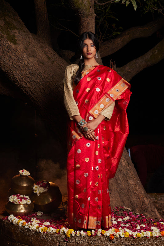 Surkh Afsana Chakri Buti Pure Silk Chanderi Saree