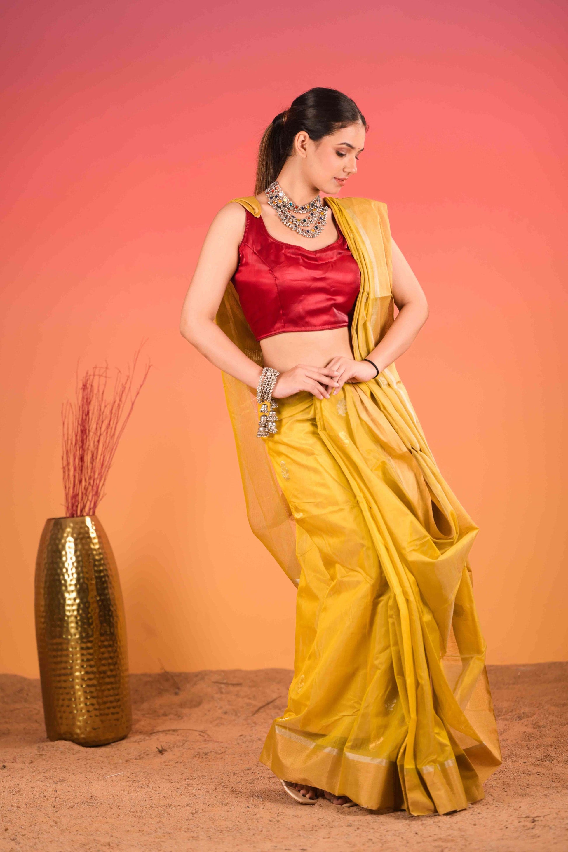 Colour: MustardFabric: Cotton Silk Zari Material: Silver ZariPrint/Work: Silver Guldasta alloverbuta saree with silver borderBlouse Piece: Comes with an unstitched blouse piece. Size: 5.30X1,1 MTRWeight: 500g ApproxDisclaimer: The blouse worn by the model in the images is for styling purposes only. The color of the saree may vary slightly from the images due to differences in screen brightness or color saturation, please acknowledge subtle variations.
