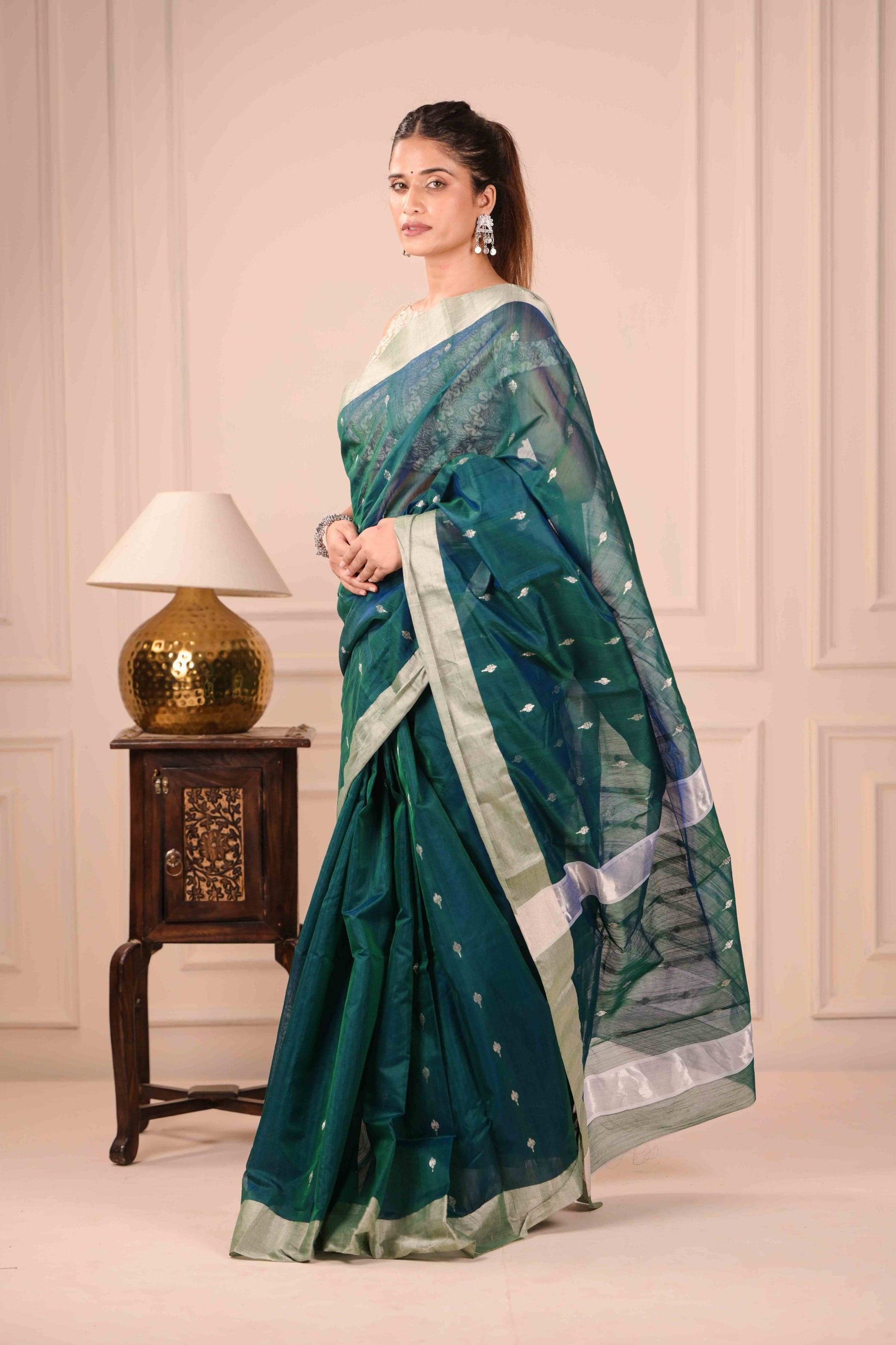 Print/Work: Green and Blue Shaded Choti Silver Buti with Silver Patti Pallu