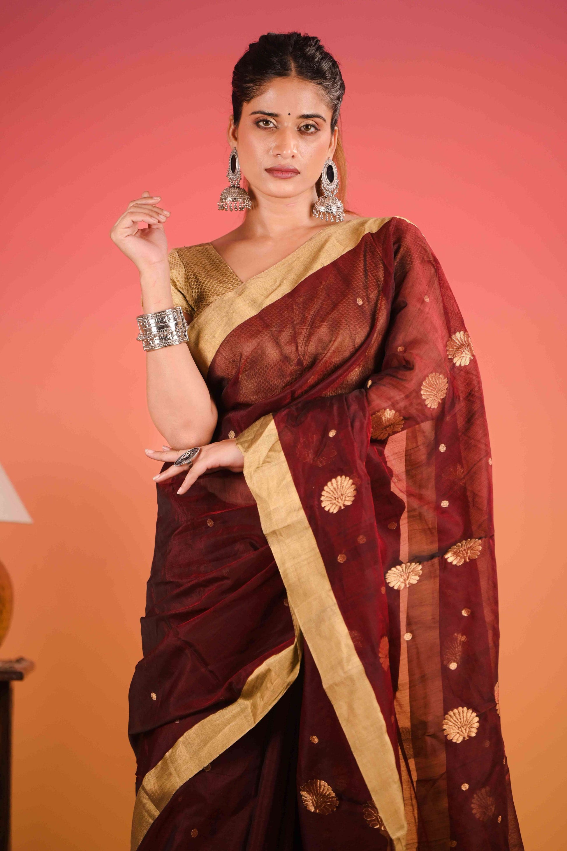 Embrace timeless tradition with this exquisite Maroon Cotton Silk Saree, featuring delicate Golden Butis across the body and a magnificent Bada (large) Flower Buta on the Pallu.
